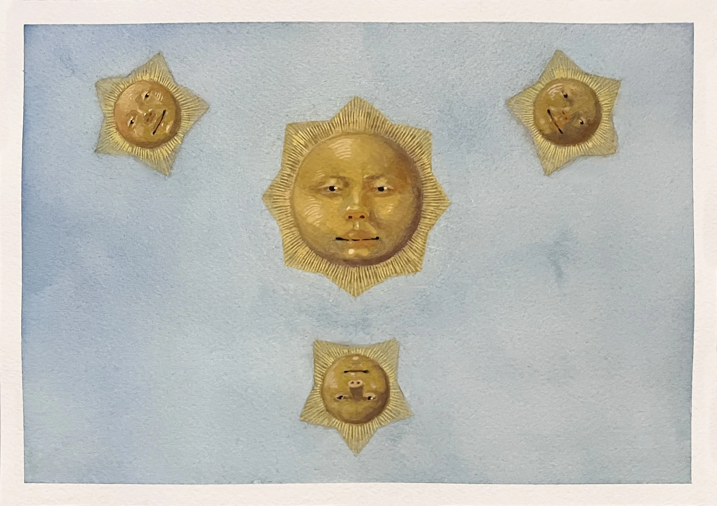 This gouache piece that acts as a small interrogation into the ways in which colonial influences are appropriated by an indigenous population. One of the Philippine’s most famous examples of the intertwining of the indigenous and colonial may be piña cloth which has roots in abaca weaving but also has the influence of the imported, non native pineapple alongside Spanish culture during the Spanish colonial period. Here, the painting looks at the history of illuminated religious texts that were used to indoctrinate and convert filipinos to Catholicism. While we fight for independence, this look at Spanish influence on our culture hopes to remind us to also interrogate the modern influence of US empire on the Philippines and think through the ways soft power are used as levers of colonial domination.