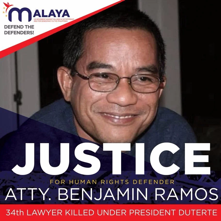 We are saddened and outraged by the murder of Atty. Benjamin Ramos, a founding member of the National Union of People’s Lawyer (NUPL) and a fighter for justice. Atty. Ramos is now the 34th lawyer killed since Rodrigo Duterte came into power, most of them targeted for their much-needed pro-bono work for victims of extrajudicial killings and other human rights violations.Atty. Benjamin Ramos is a well-known human rights lawyer and Secretary General of the National Union of People's Lawyers (NUPL) - Negros Occidental Chapter. He was described as “passionate, dedicated and articulate yet amiable and jolly,” and for the longest time was “the run-to-pro-bono-lawyer of peasants, environmentalists, activists, political prisoners and mass organizations in Negros.” He was taking a break by a store in Kabankalan City after finishing a legal paper for another client when he was shot to death by two assailants riding tandem on a motorcycle on the night of November 6, 2018. Atty. Ramos was one of the lawyers who assisted the “Mabinay 6,” youth activists erroneously accused of being New People’s Army fighters, and the “Sagay 9” massacre victims and survivor, farmworkers who were occupying a vacant portion of Hacienda Nene in Sagay City, Negros Occidental.The Duterte regime’s stand against human rights and democracy in the Philippines has encouraged more attacks on human rights defenders, activists and the poor, under the banner the so-called “war on drugs” and his counterinsurgency campaign, Oplan Kapayapaan. It is no coincidence that earlier this year, Atty. Ramos, among many other legal personalities and human rights defenders, was featured on a photo poster created by the Philippine National Police (PNP), declaring them as members of the Communist Party of the Philippines, New People’s Army, and National Democratic Front of the Philippines, practically declaring them as enemies of the state. Lawyers like Atty. Ramos should not be attacked for the exercise of their profession. The vilification of human rights defenders is part of the Duterte administration’s attempt to justify the extrajudicial killings and silence government critics.We are also deeply disturbed that the United States continues to condone these atrocities by its continued pledge of financial aid to the Philippine government despite growing international condemnation. Just this past July, the United States announced an additional $26.5 million in U.S. tax dollars to the Philippines, to beef up support for the Philippine National Police on top of the $184.5 million that goes towards the Armed Forces of the Philippines (AFP) for the next two years, as part of its counterterrorism plan. The continued funneling of U.S. tax dollars are tantamount to U.S. government’s active support and complicity in the ongoing human rights crisis in the Philippines.We, the undersigned, call for justice for Atty. Benjamin Ramos and all victims of human rights violations under the Duterte regime. We call on all Filipinos and the American people to join the struggle against the killings and the creeping Duterte dictatorship. Let us support the fight for genuine freedom and democracy in the Philippines.We demand that the Duterte regime stop its attacks against human rights defenders and end its murderous campaign against the poor and activists.We demand that the United States government end its support and complicity in the human rights crisis in the Philippines by cutting all U.S. tax dollars for the PNP and the AFP.Signed,MALAYA MOVEMENTDr Dante C. Simbulan, Malaya Movement Co-ConvenerDr. Ligaya McGovern, Malaya MovementNerissa Balce, Malaya MovementFilipino American Law Society of Santa Clara University- FALS SCUMovimiento de Accion, Inspirando Servicio (MAiZ)GABRIELA USAAnakbayan San DiegoARA-URCICHRP Pacific NorthwestNew Jersey Forum for Human RightsMigrante Orange CountyGreater Malden Asian American Community CoalitionGabriela Washington D.C.Santa Clara County Wage Theft CoalitionPastor Stephen Lee, Alum Rock UMCHannah Duhaylungsod, NEFFCONPrimo Racimo, St. Margari of Scotland Episcopal ChurchPastor Ruth Casipit Paguio, Holy Family Episcopal Church of San JoseCandice Sering, GABRIELA NYMomo Manalang, Gabriela New YorkEllen Cachola, Decolonial Pin@yTaiji Miyagawa, Progressive Asian Network for Action (PANA)Jasper Perry-Anderson, Student Labor Action Coalition, Oberlin CollegeTabs G, Portland Committee for Human rights in the PhilippinesJordan Faralan, Anakbayan SeattleIsabella Jaravata, Anakbayan SeattleMichael Alcantara, Anakbayan SeattleRodrigo Bacus, NYCHRPGlenn Ramirez, NYCHRPJhong Delacruz, Migrante Youth Fort Washington MDKarol Ruiz, Wind of the Spirit Immigrant Resource CenterRogyn Beyao, Cordillera Peoples Alliance (CPA) KalingaKate Dolorito, Diwang KabataanJackelyn Mariano, National Lawyers Guild International CommitteeMarijo Pempena, GABRIELA LAKerina Koch, Gabriela OaklandRuth Silver-Taube, Santa Clara County Wage Theft CoalitionROXIE TORRES, Gabriela SeattleJessica Valdez, GABRIELA SeattleAlec Summerfield, Baltimore Prisoner Solidarity CommitteeJane OrendainLorna VicenteGlenn HodginsFlorence SumTaiji MiyagawaLuis FranciaAmee ChewDon BrennockSulan MlynarekMichelle FosterAngelie GoloJulianne GaleSarita SeeEfleda BautistaJavier JardelezaPeter ChuaMarynoel StropeSophia HooverLuke PattersonJorge RodriguezAlisa BierriaJennifer Sta.AnaDenyri DumancasSulan MlynarekKiriko Takahashi, Esq.CLICK HERE TO SIGN ON: Defend the Defenders!