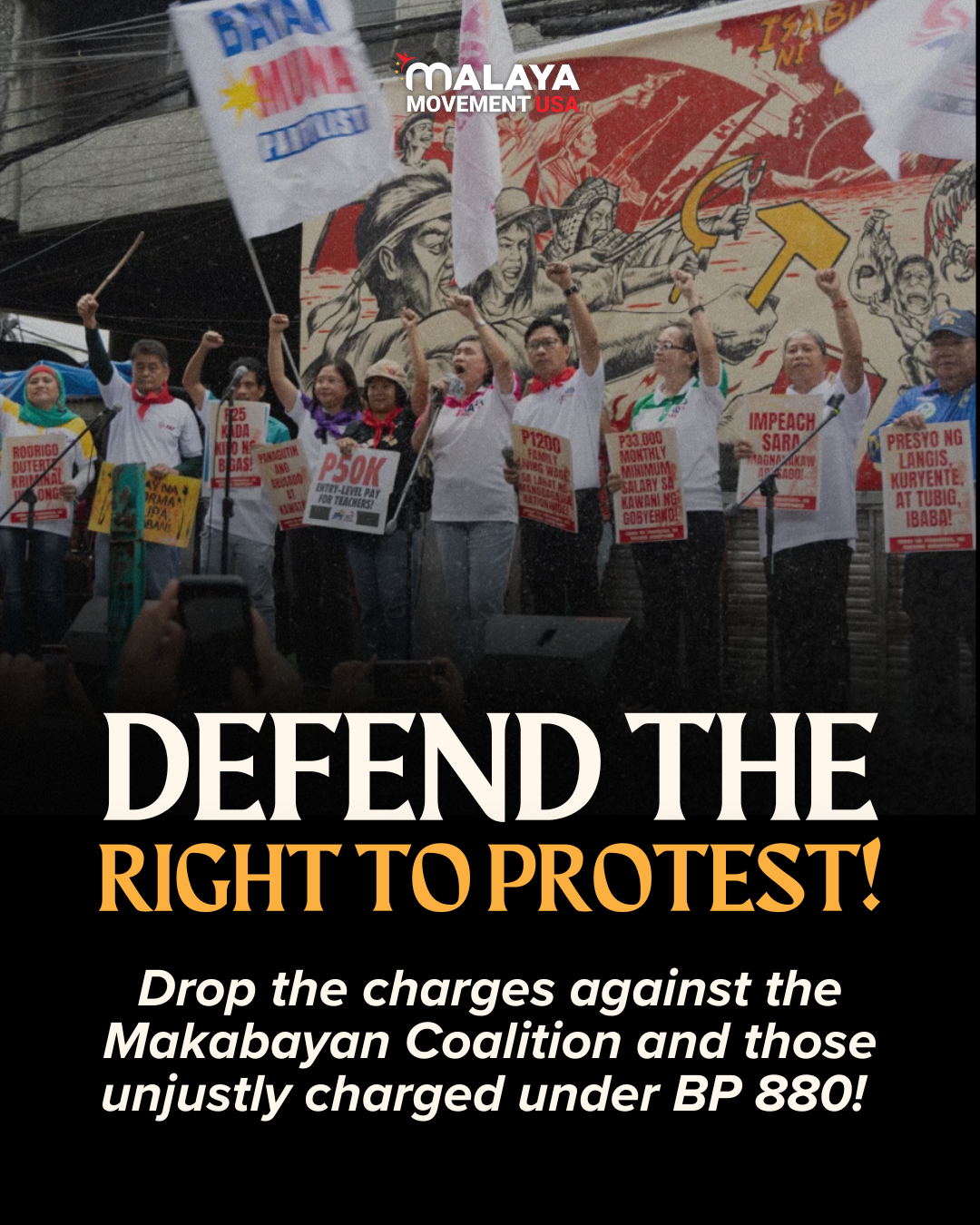 As fascism continues to reign over the Philippines, it is imperative that we do all that we can to amplify the genuine efforts of the Filipino people to defend democracy. Malaya Movement USA echoes the call to drop the charges against the Makabayan Coalition and those unjustly charged under BP 880! We call on US legislators to hasten the reintroduction of and the passing of the Philippine Human Rights Act to stop more of our tax dollars from funding these fascist attacks.