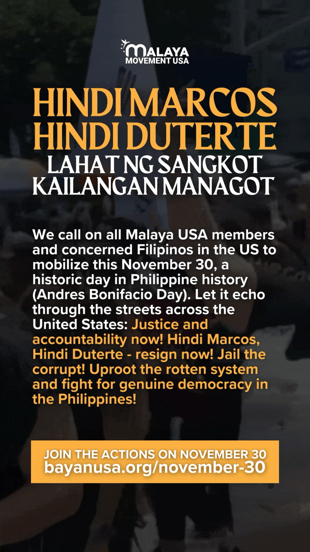 We call on all Malaya USA members and concerned Filipinos in the US to mobilize this November 30, a historic day in Philippine history (Andres Bonifacio Day). Let it echo through the streets across the United States: Justice and accountability now! Hindi Marcos, Hindi Duterte - resign now! Jail the corrupt! Uproot the rotten system and fight for genuine democracy in the Philippines!