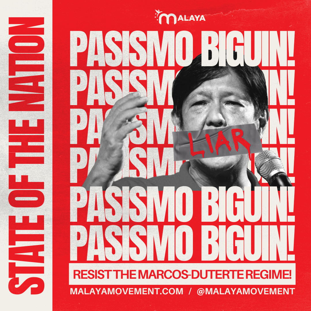 In spite of all the violence inflicted by the Marcos regime, the people have remained steadfast in their efforts to resist the fascist regime. Join Malaya USA in our efforts to hold People’s State of the Nation Address actions across the country to expose the real situation under Marcos Jr. 's illegitimate rule. We must highlight the real state of the nation and expose Marcos Jr. for his failures and inadequacies as the President, and uplift the people’s demands for genuine democracy, human rights, and sovereignty in the Philippines.