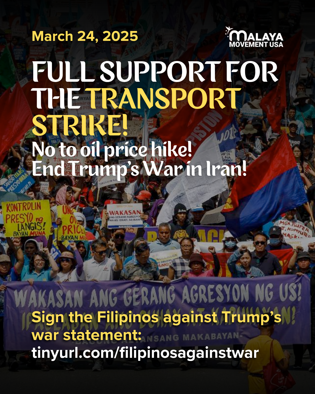 Malaya Movement USA expresses its solidarity with the March 19-21 transport strike of 10,000 drivers in the Philippines. For two days, jeepney drivers, led by PISTON (Pagkakaisa ng mga Samahan ng Tsuper at Opereytor Nationwide), protested the soaring price of oil due to the US-led war with Iran and its destabilizing effects throughout the Middle East. We stand with the newly formed No to Oil Price Hike coalition that will be launching another 2 day strike from March 26-27.